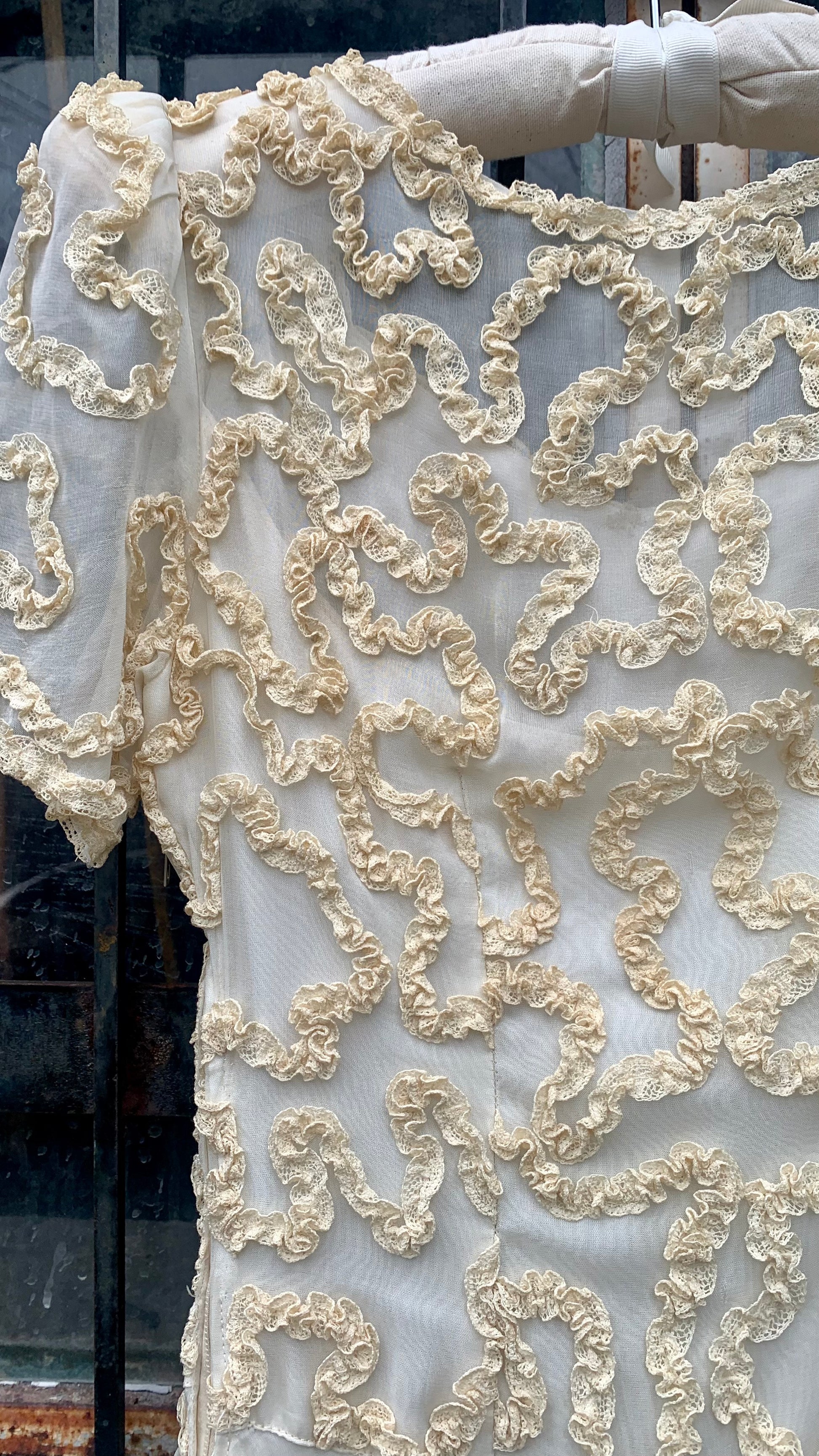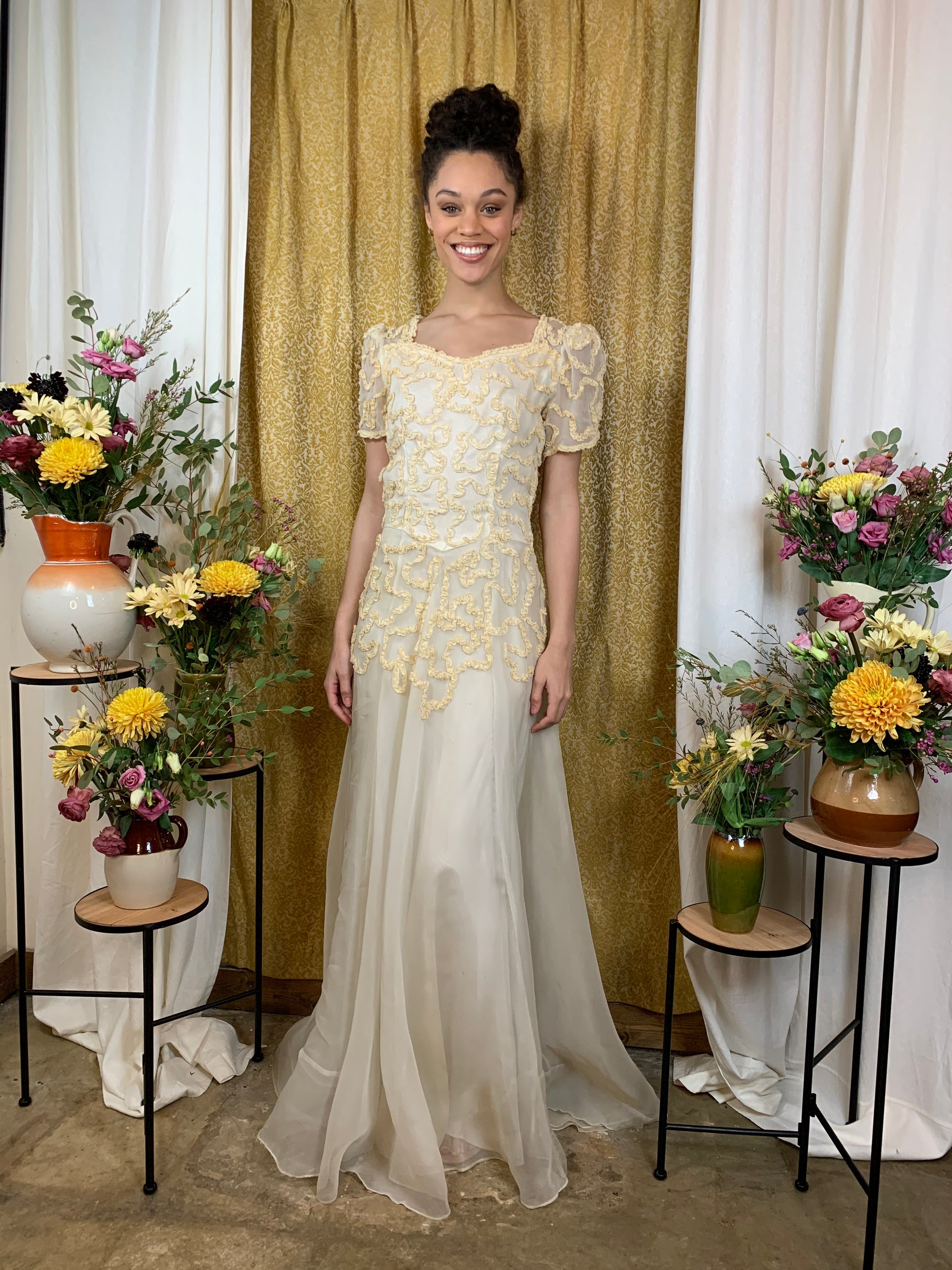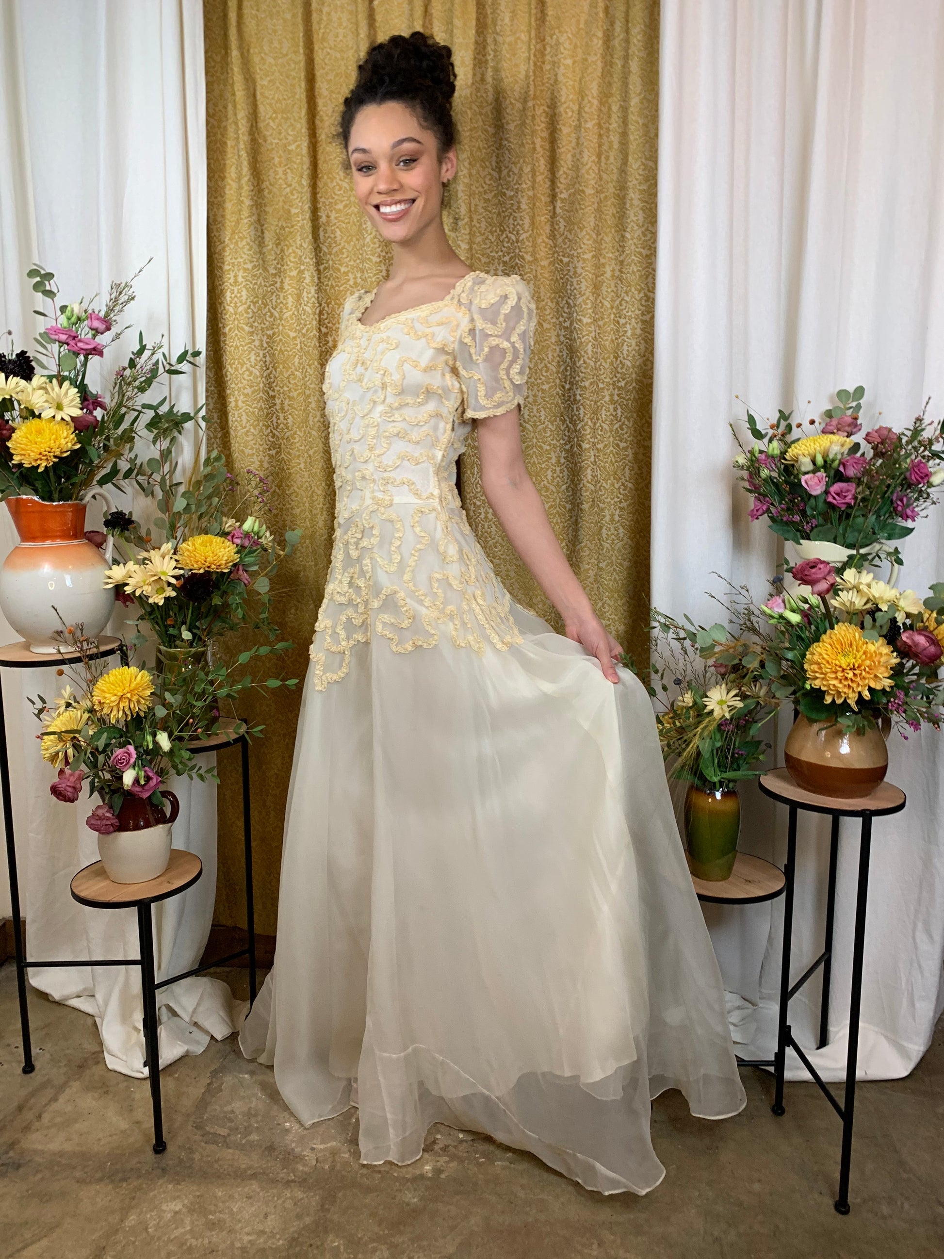Stunning 1930s soutache lace appliqué and chiffon wedding gown in amazing condition in consideration to its age. Soutche appliqué is S-curved and continuous throughout the bodice, adding wonderful dimension and eye-catching texture to the otherwise soft nature of the gown. Dress itself is a soft cream, while the soutache appears to be a warm buttermilk color; this yellowing may be due to age, although we can't say for sure. Beautifully fitted through the torso with gently puffed sleeves, and a perfectly draped skirt. Skirt has a cream satin lining underneath the chiffon. Floor-length hem has a subtle bias cut flutter; length may vary an inch or 2 in some places. Metal zipper on the side is the only closure.