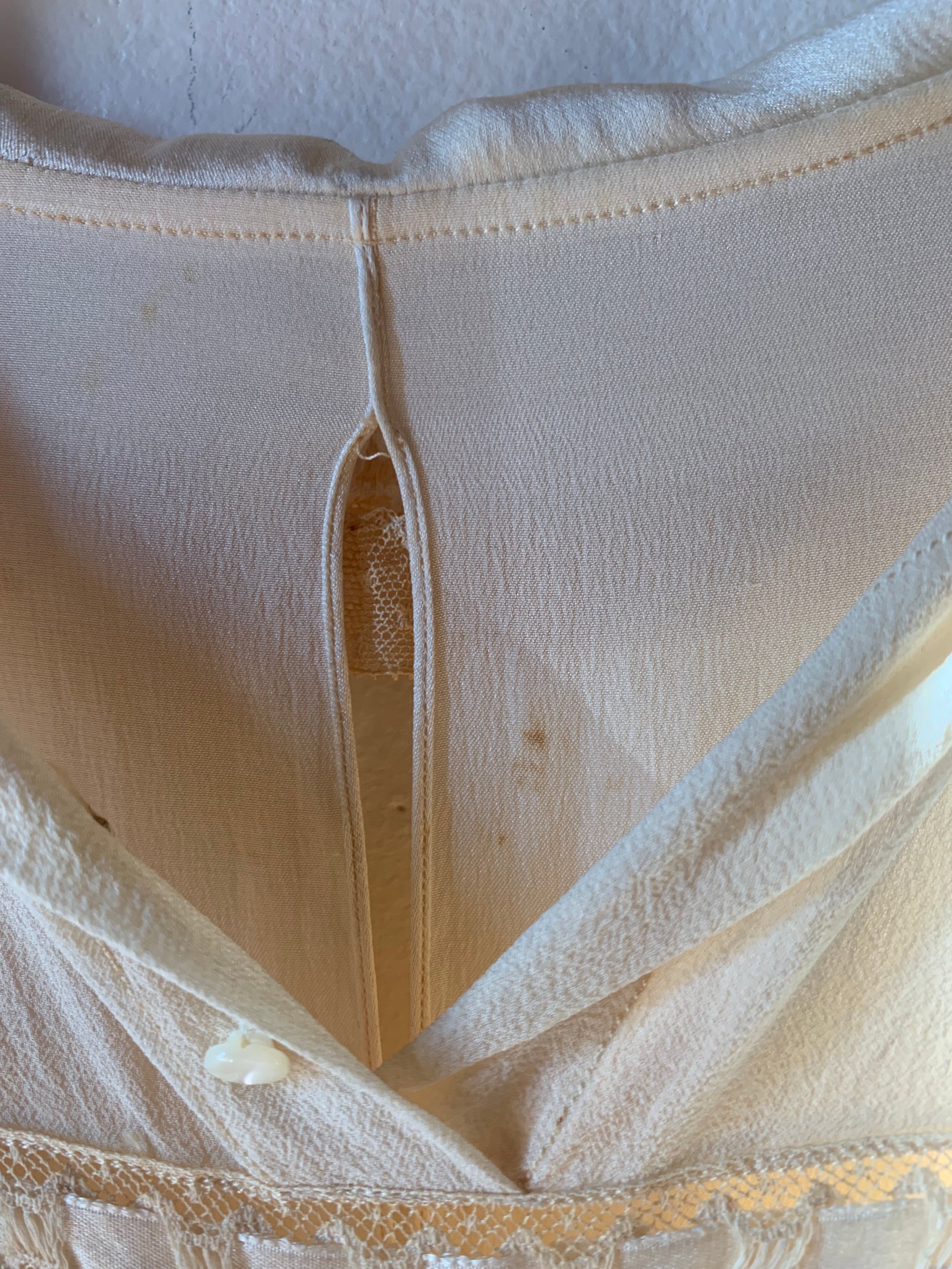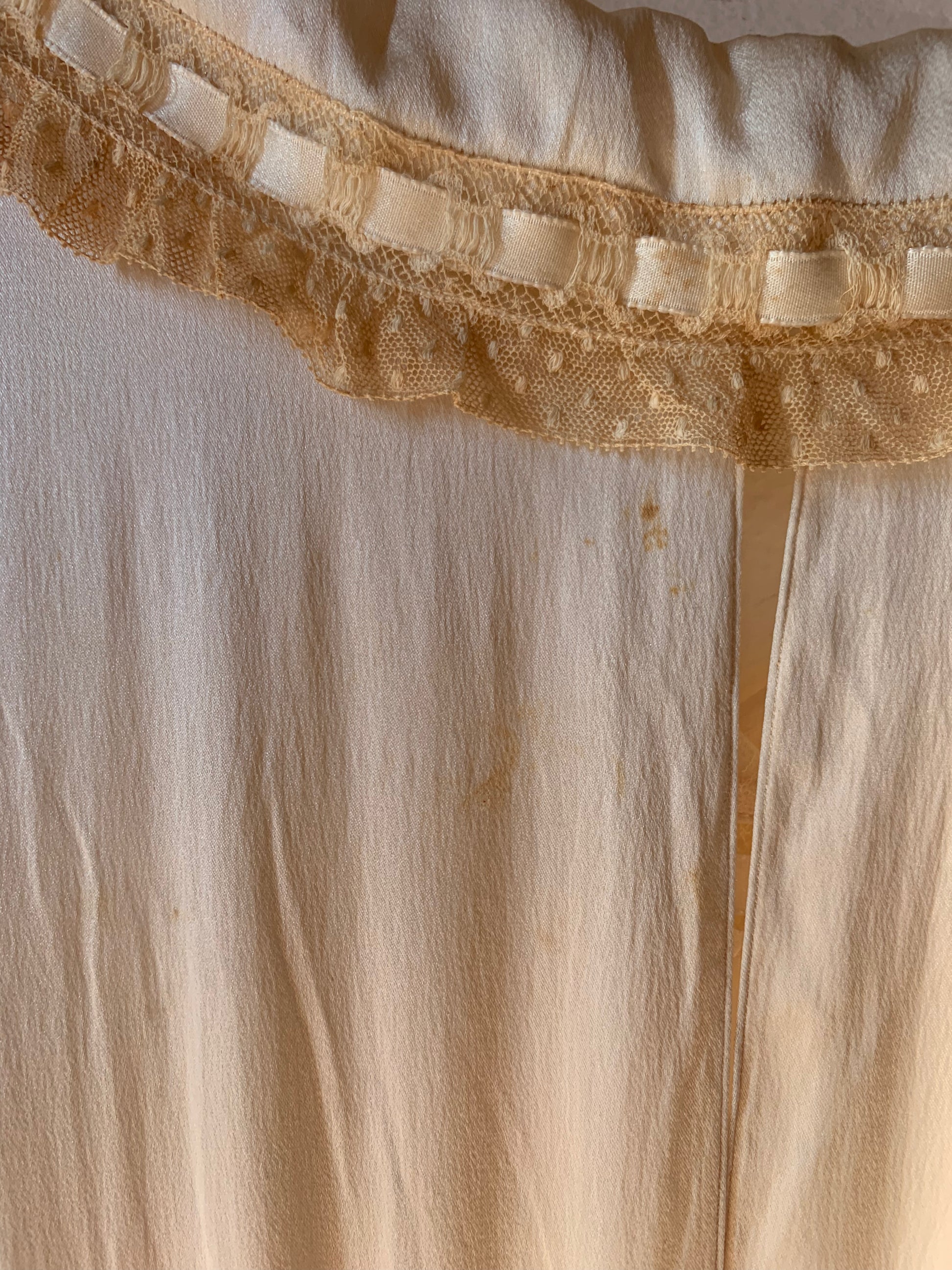 Stunning 1930’s cream silk dress with beautiful lace details. Material is a bit transparent and would be best to wear a slip underneath. Does have signs of wear throughout like snags, small discolorations, and small holes. Still very wearable and such a special piece.