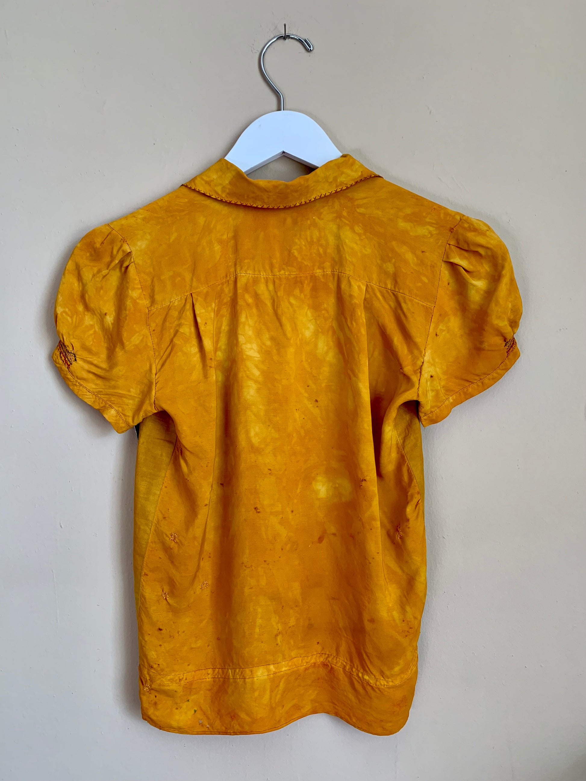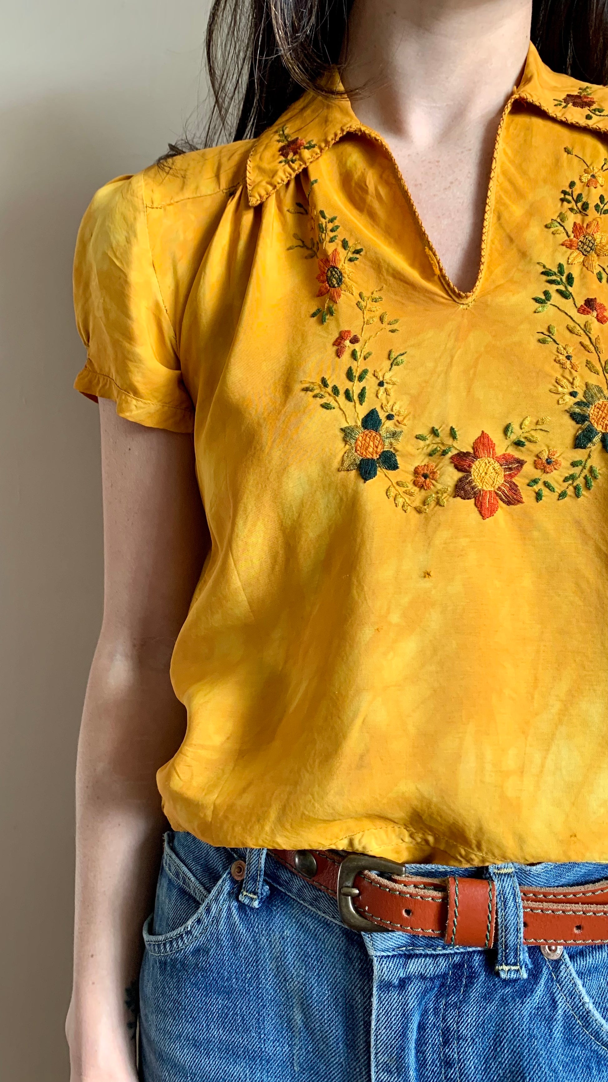 Stunning and bright vintage 30s-40s silk Hungarian embroidered blouse in good vintage condition. When we acquired this blouse, it was cream with stains that would not come out. We dyed it a beautiful marbled marigold with a mid-century Putnam dye to give it a new lease on life. Beautiful rainbow floral embroidery detail throughout. No zippers or buttons, just slips over the head. Though in very wearable condition, does have a somewhat delicate quality that requires care when putting on or taking off. There are several small pinholes, most noticeable on the back. We darned up the largest ones. Despite its wounds, this piece presents beautifully.