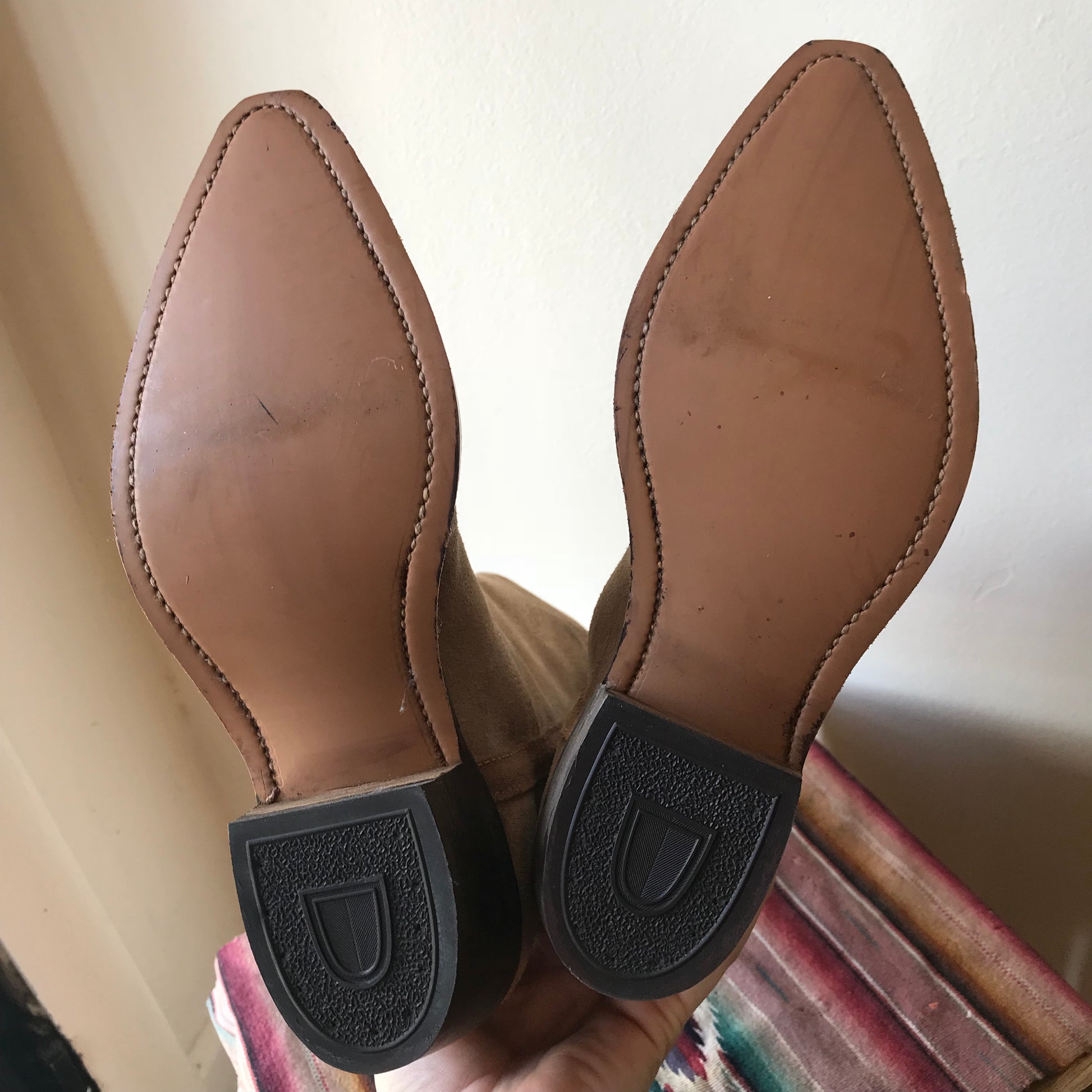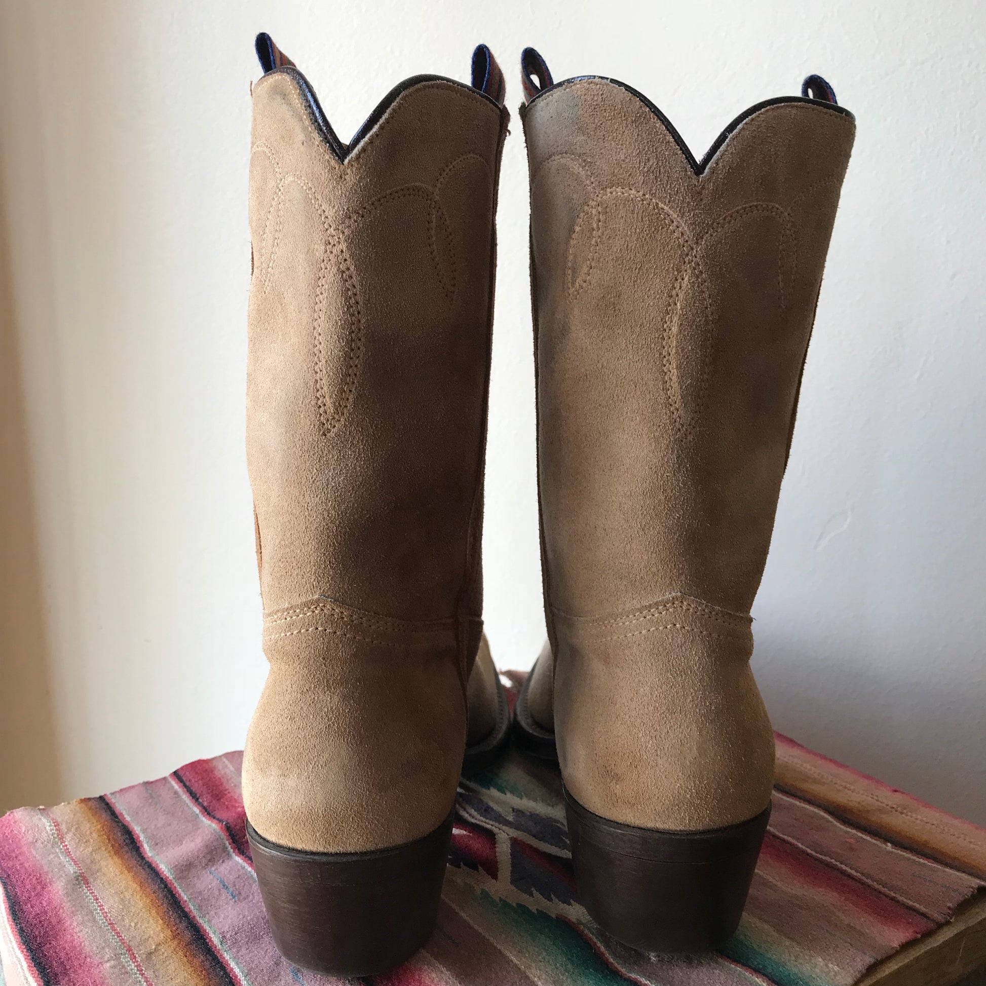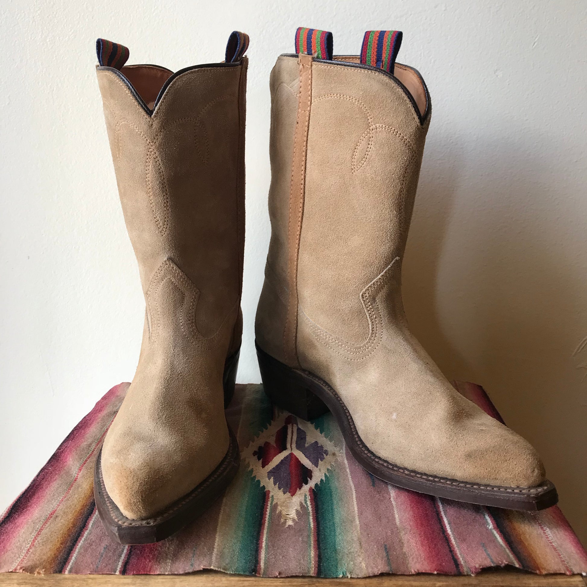 Beautiful, tan suede cowboy boots. Hardly ever worn, no scuffing on soles. Rainbow colored boot pull strap. Minor stain marks in the light colored suede, see photo. Detailed stitching. In excellent vintage condition.