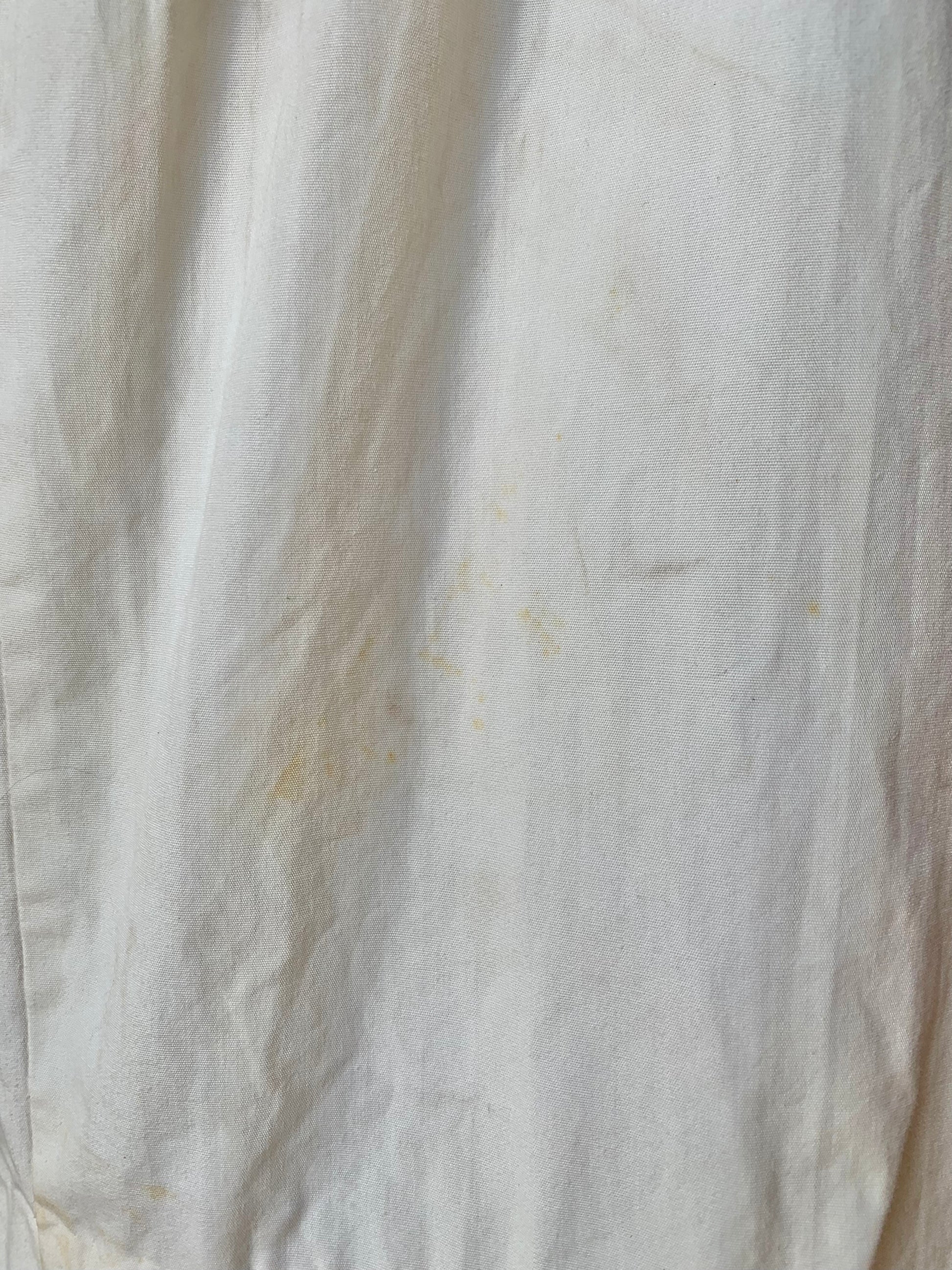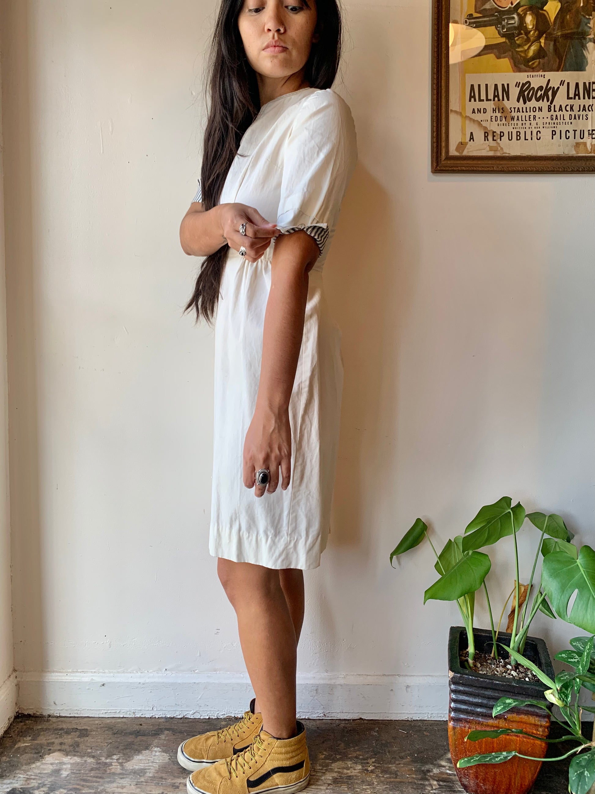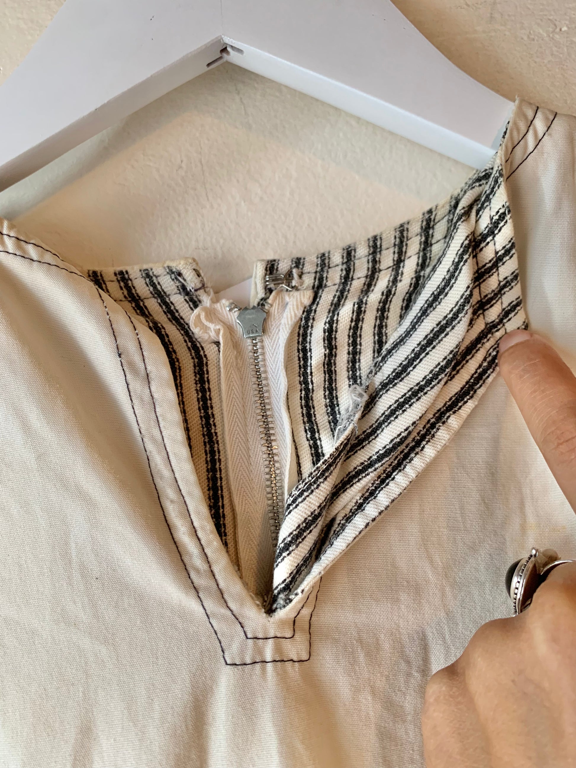 The sweetest little off white 60s dress. It appears to be a one of a kind homemade piece. The collar and sleeve features black pinstriped lining and black stitching. Sleeves can be folded to show pinstriped cuff. The dress zips up the back with a hook clasp up top. The waist has 3 intact string belt loops, but does not include the original belt. There are a few small light stains on the dress that are pictured.