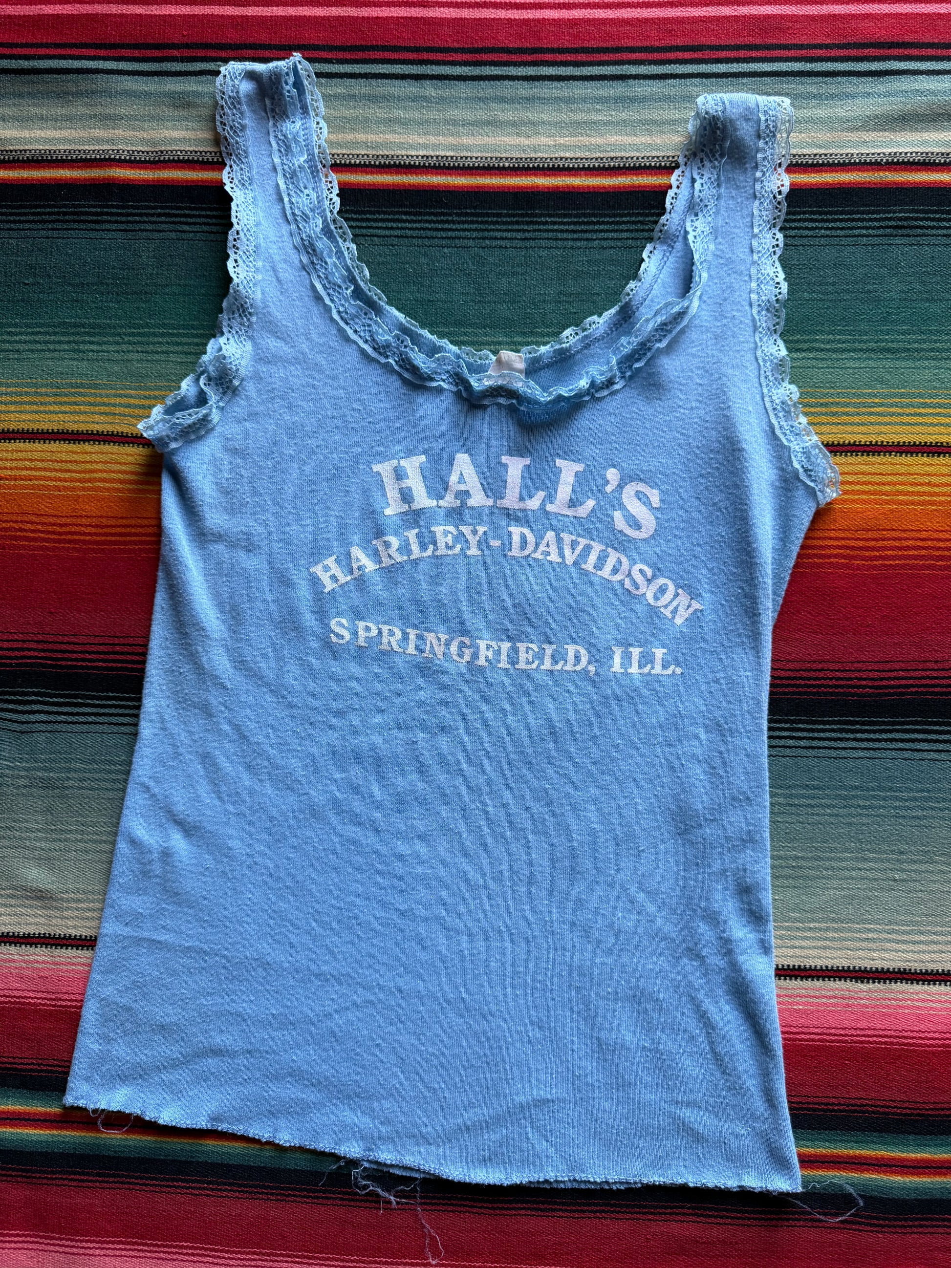 Amazing 1980s lace-trimmed Harley tank in a great sky blue color with a hot pink rose. Lots of stretch!