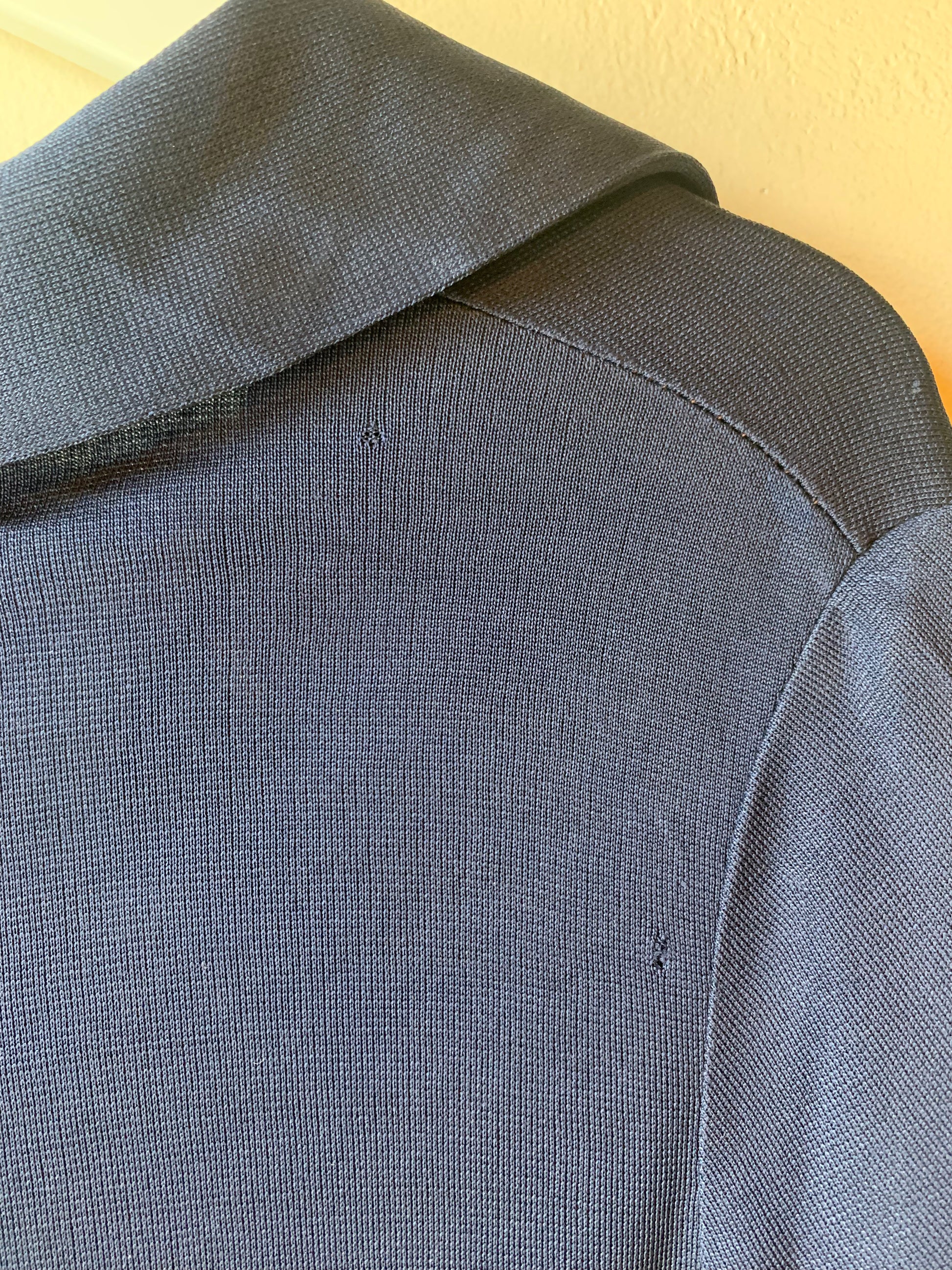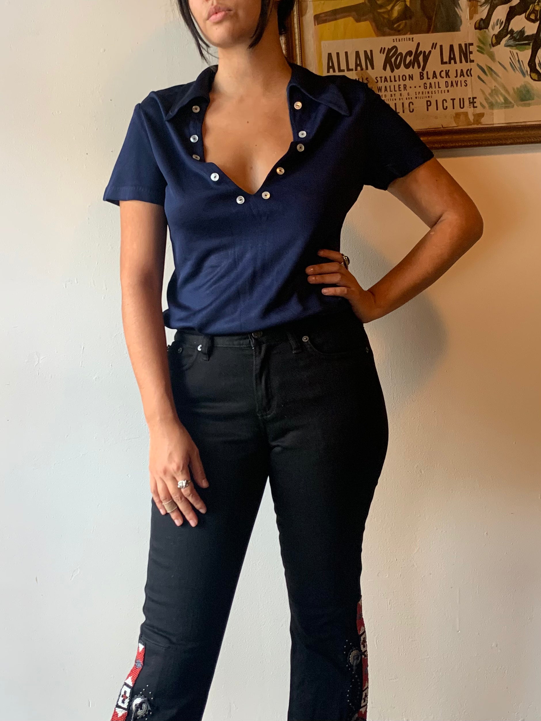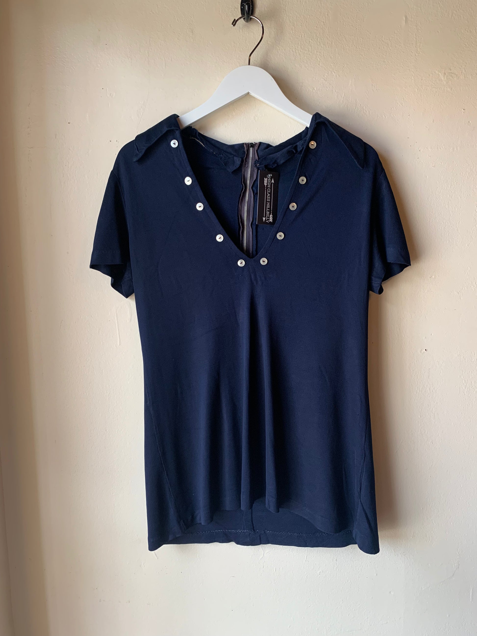 Navy blue plunging v neck polo shirt. Has iconic 70’s dagger collar and cool button details. Zips up in the back. Couple small pinholes but in otherwise good condition
