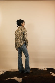 This nostalgic piece features a charming floral pattern and a classic button-down design, capturing the essence of the era while offering a timeless style. Made of a cotton blend, this shirt is lightweight and on the thinner side.
