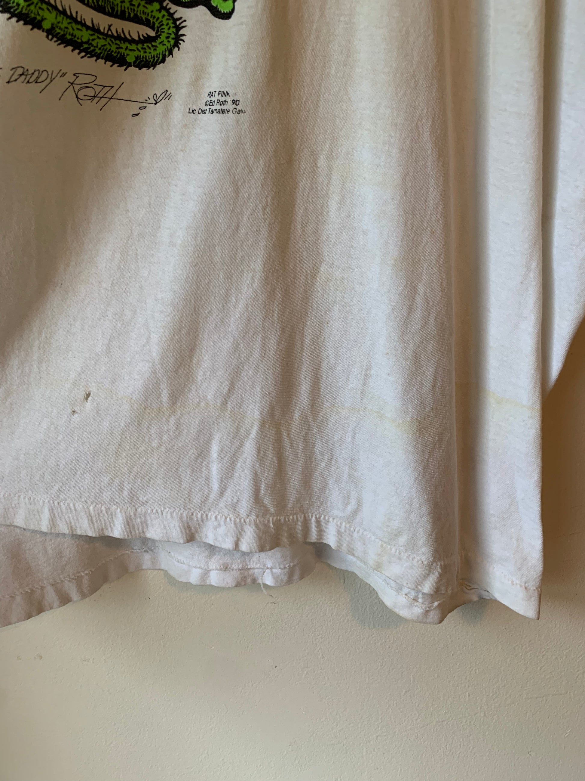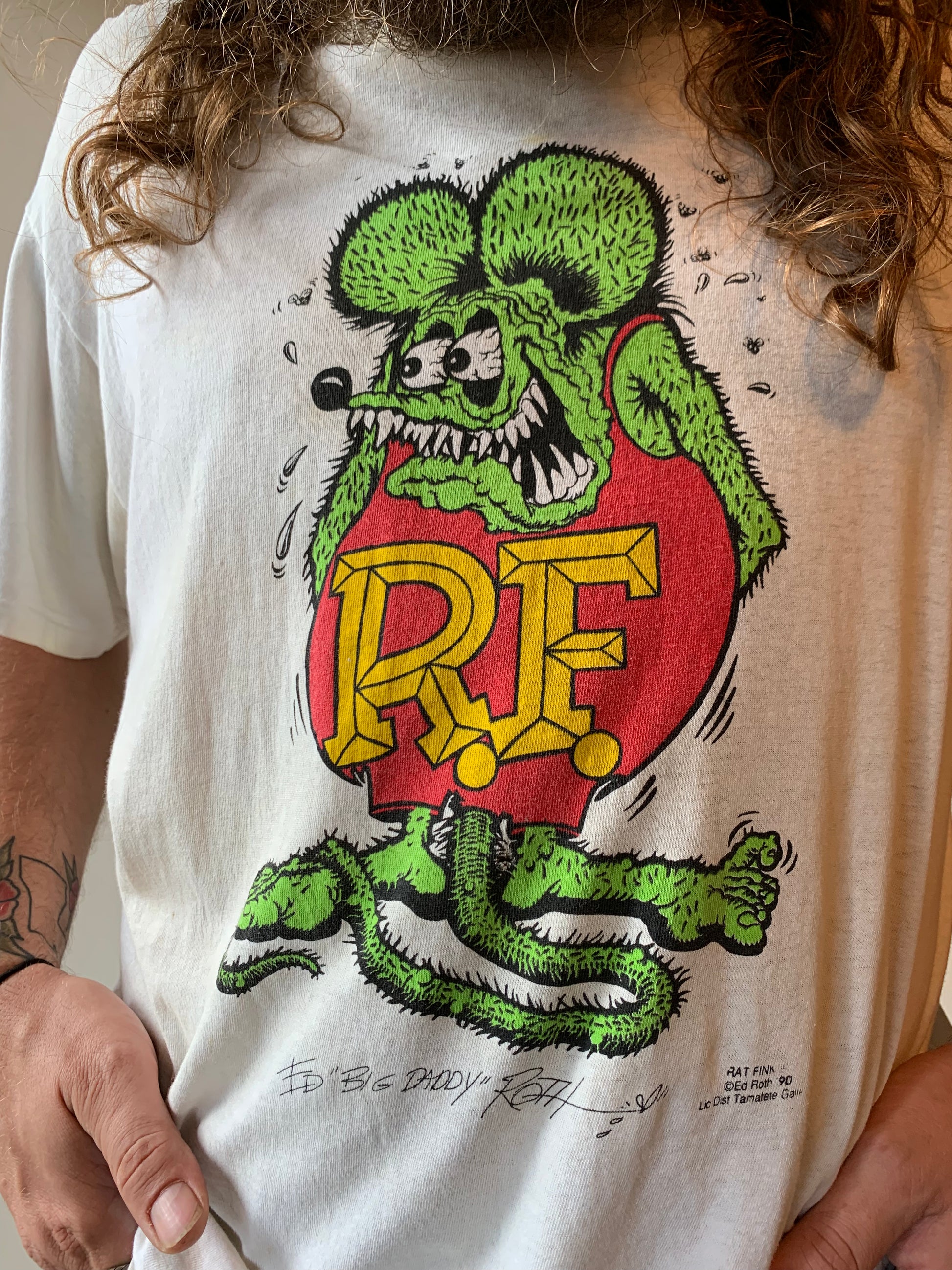 Rad 90’s iconic Ed Roth Rat Fink tee. Very soft and perfectly worn in. Does have signs of wear like a few pinholes and small discolorations. In otherwise good vintage condition.