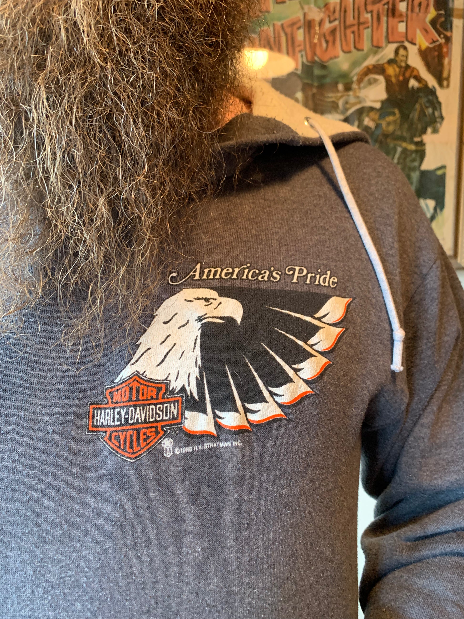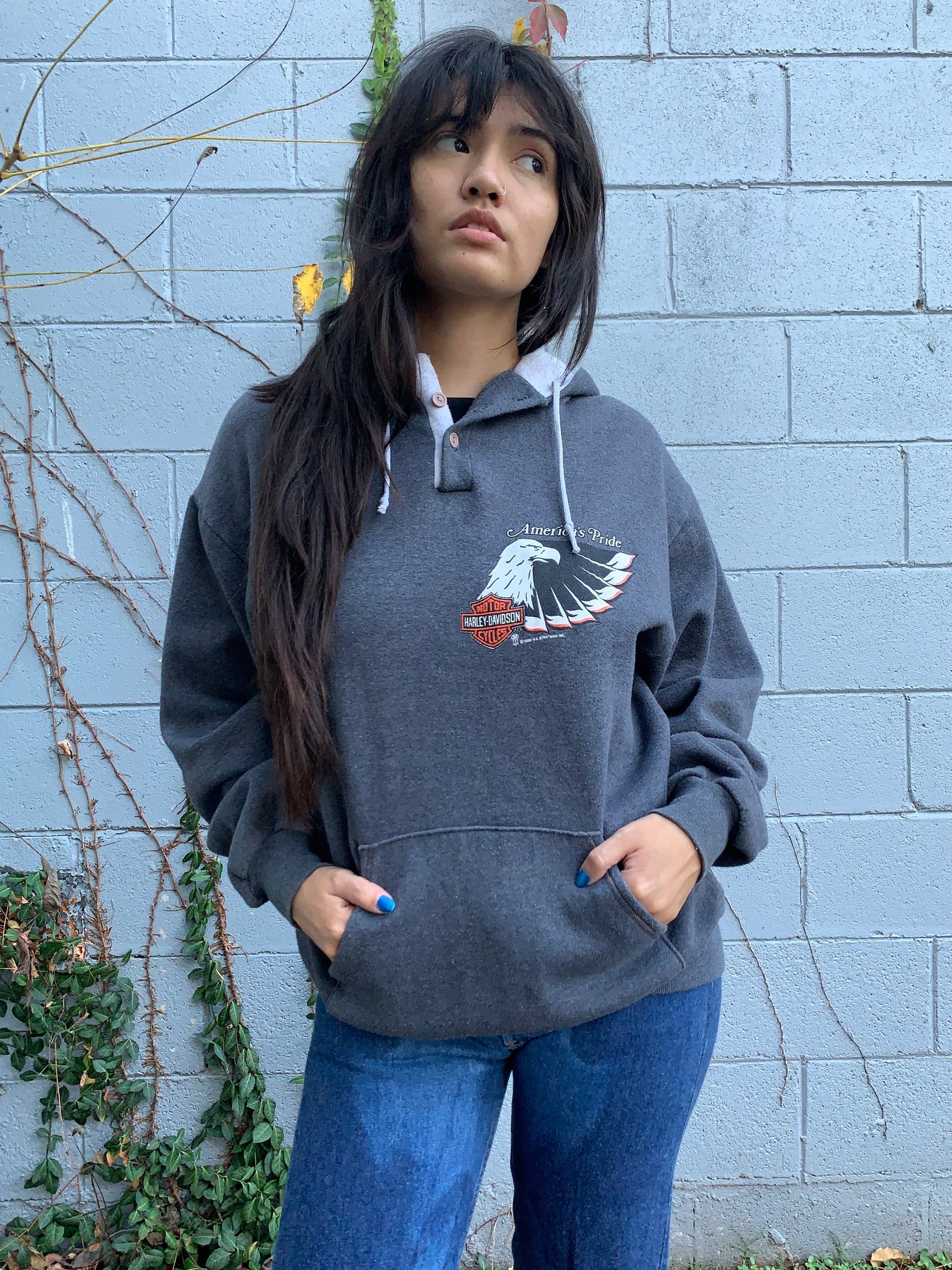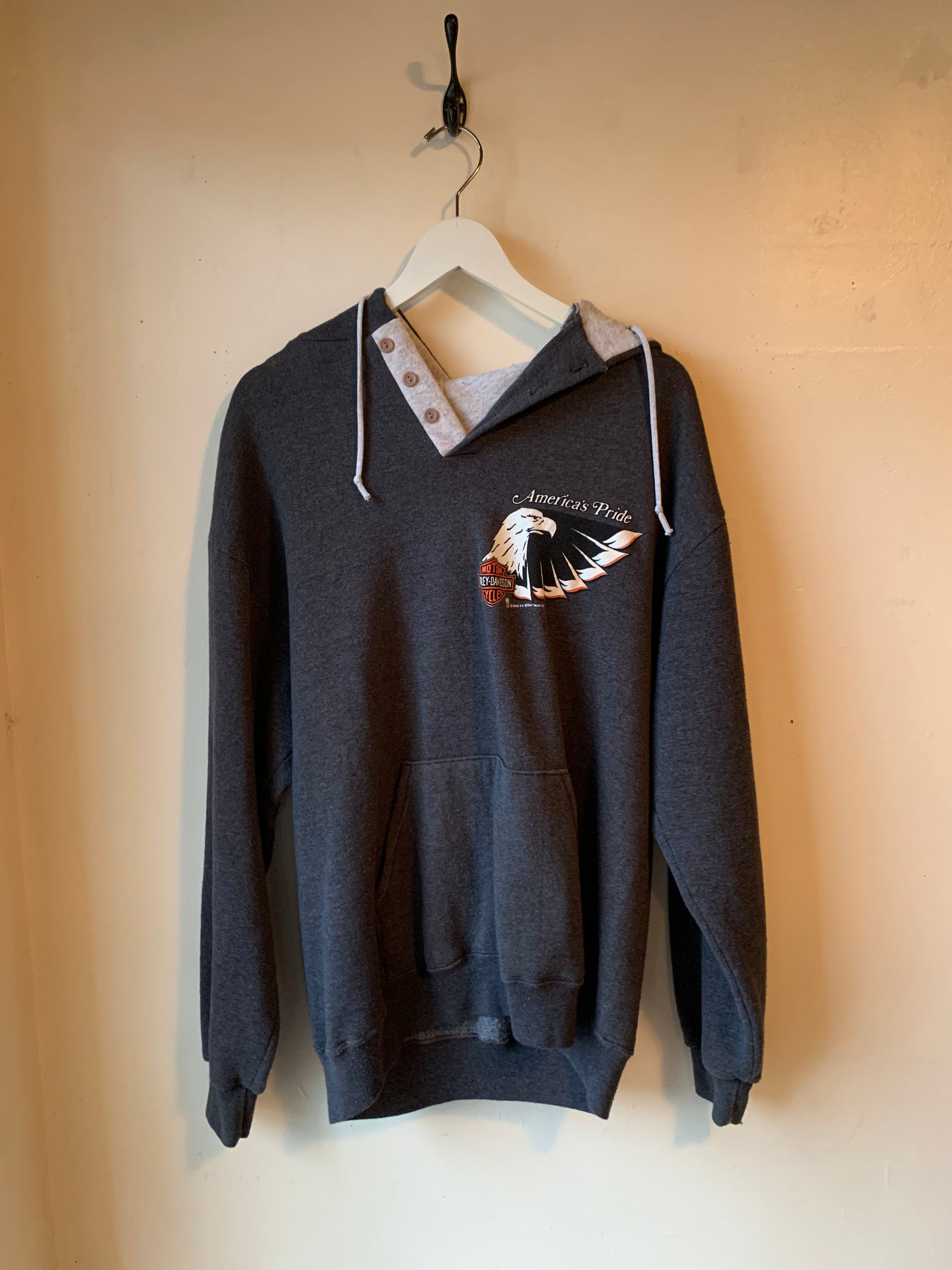 Badass 1988 Harley Davidson America’s Pride sweatshirt. Features 3 button at the collar and hood. Nice and soft. In good vintage condition with no notable flaws.