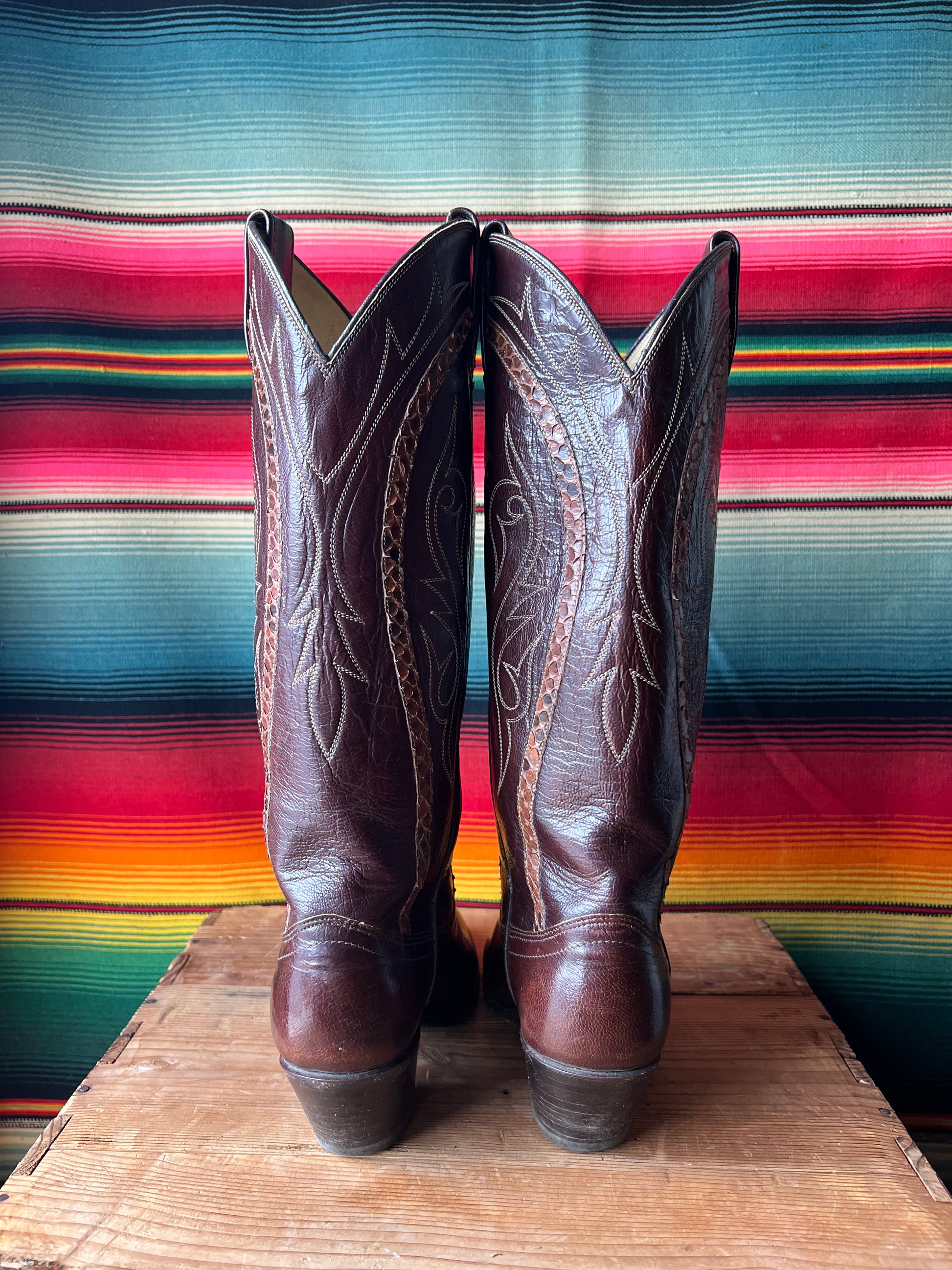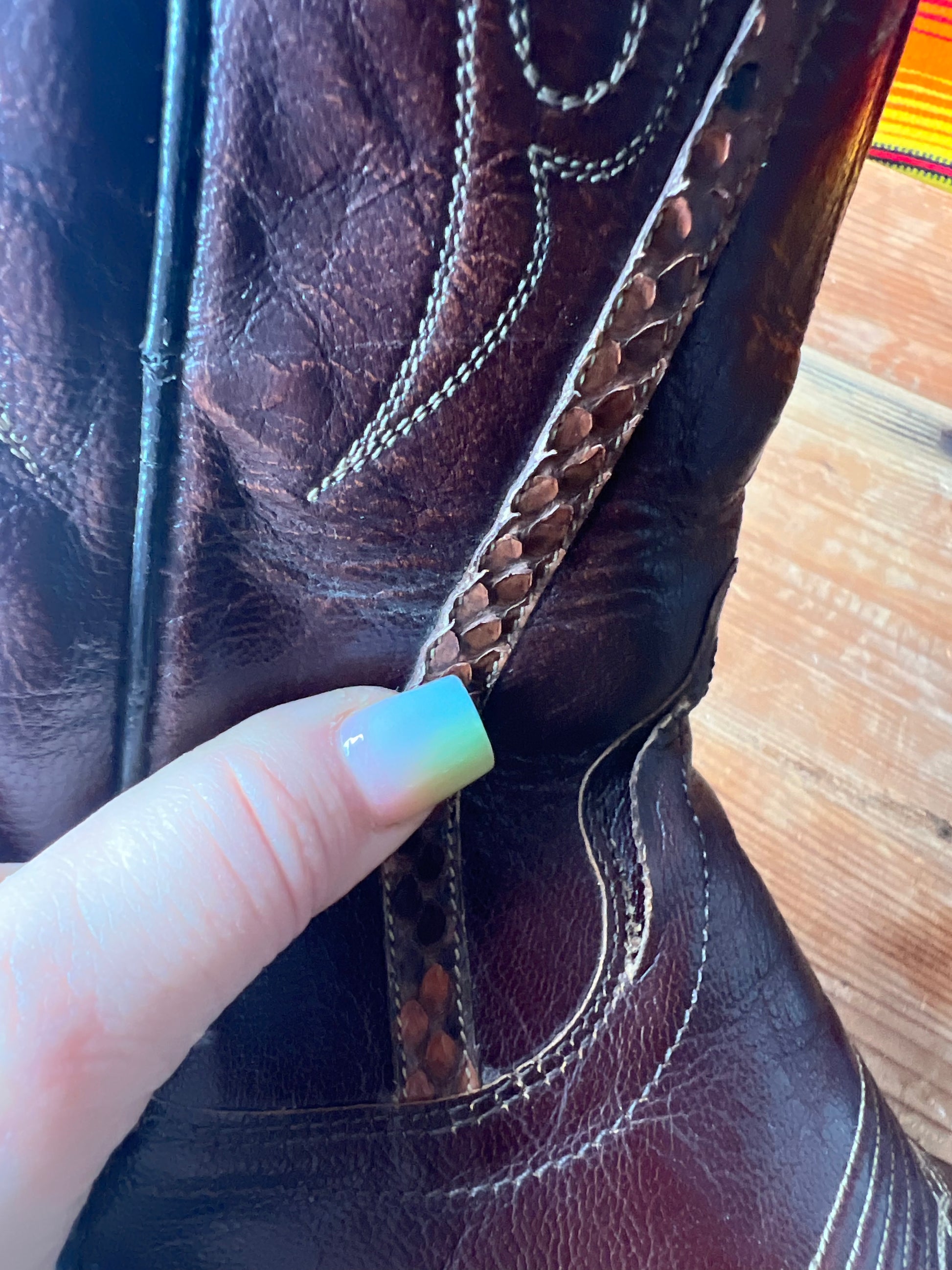 These gorgeous Dan Post Cowboy boots are show stoppers! With rich brown/mahogany tones and snakeskin detailing, these are the perfect boots!