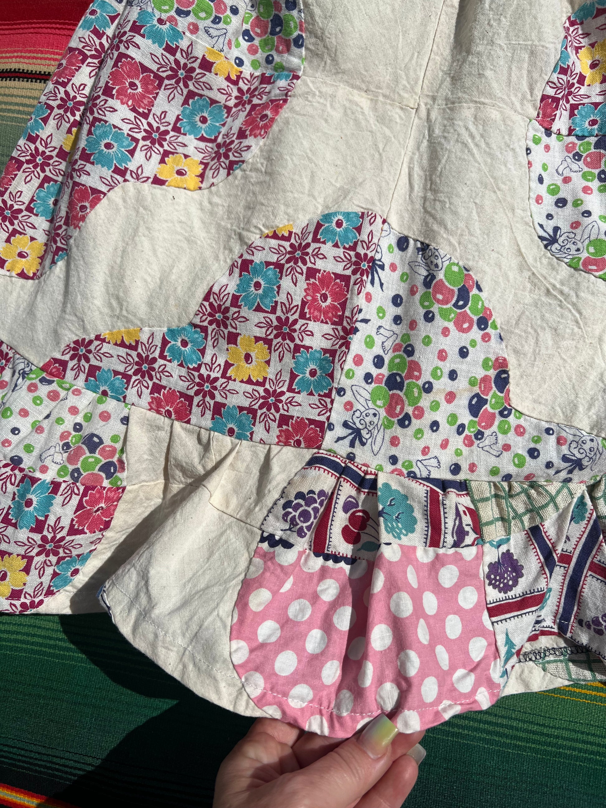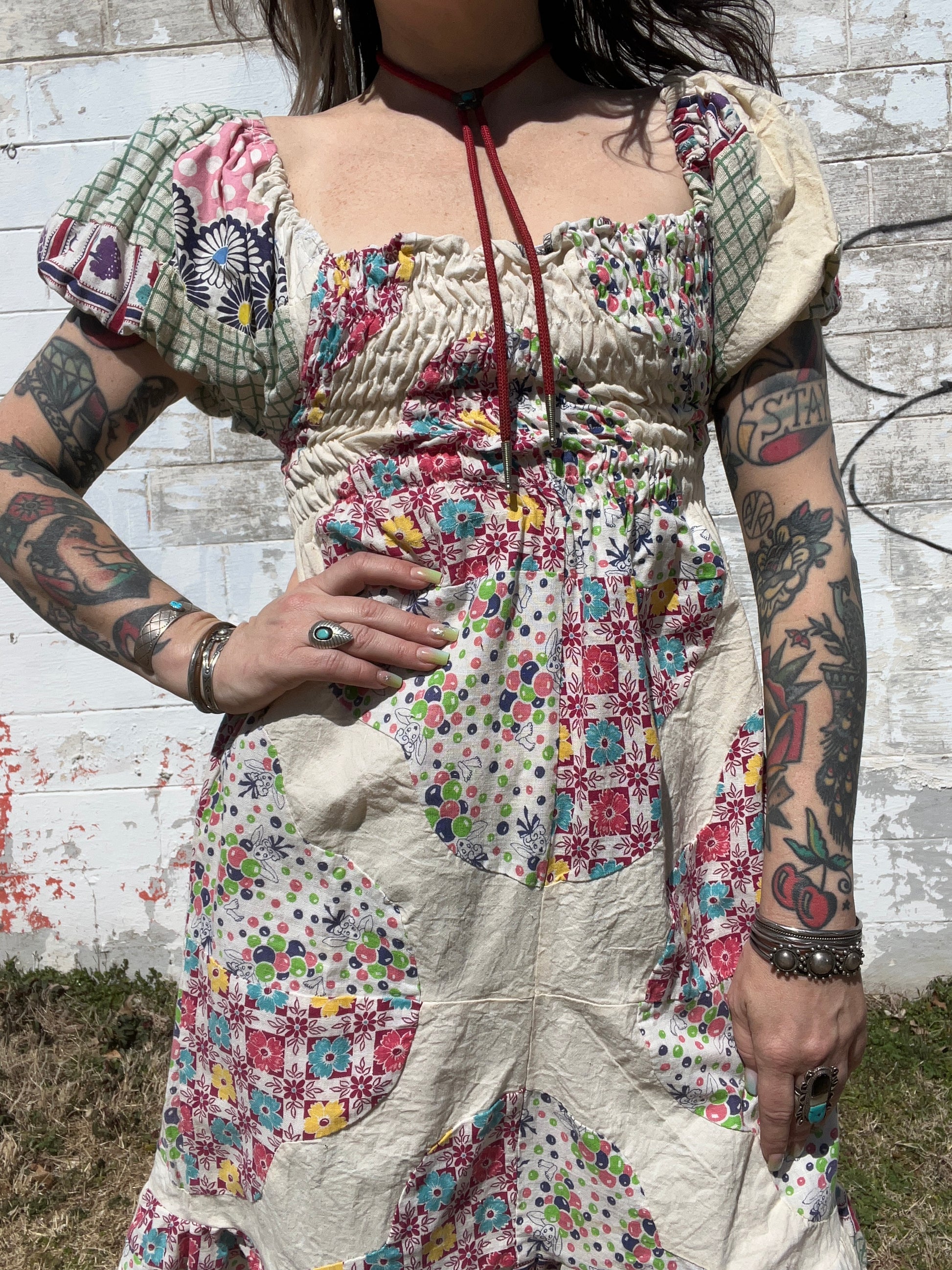 Adorable dress handmade from vintage quilt toppers. Features puff sleeves, a smocked bodice, and a ruffle hem. Too cute!