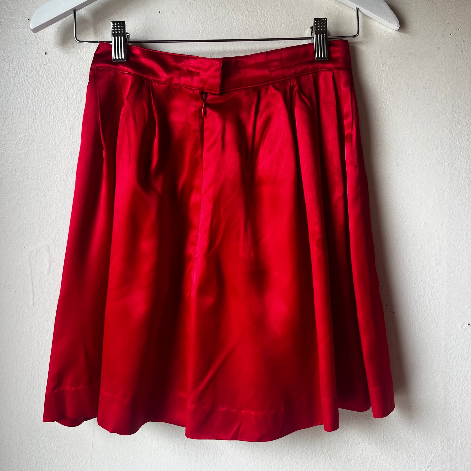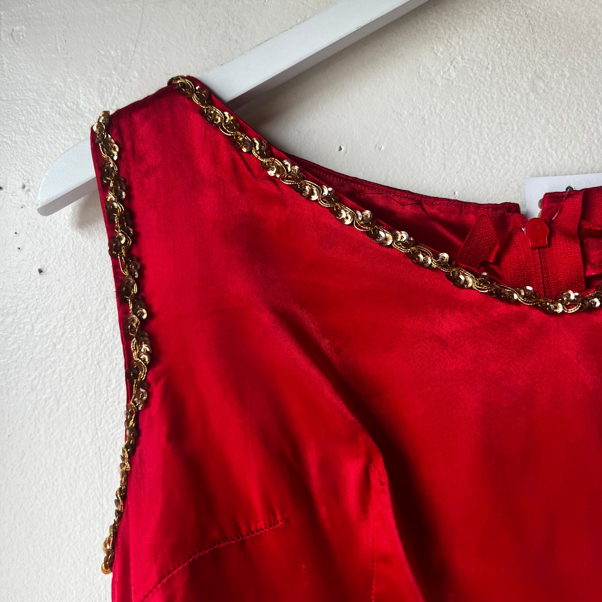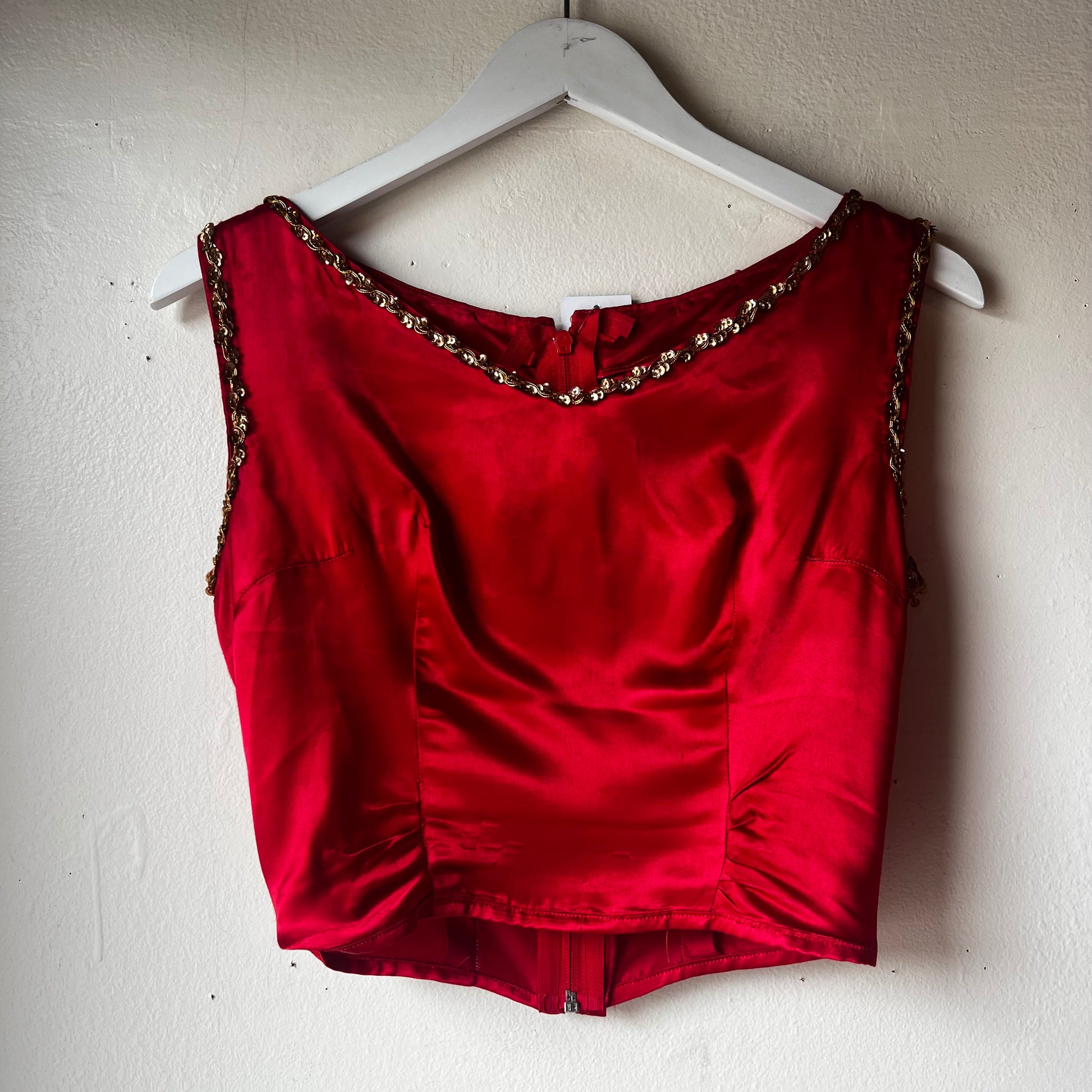 This gorgeous two piece red satin set is of our dreams! With gorgeous gold sequin and thread outlining the top seam on the top, this is a stand out piece! The pleated skirt adds the perfect amount of volume. Full length zipper on back of top and half zipper and clasp on skirt.