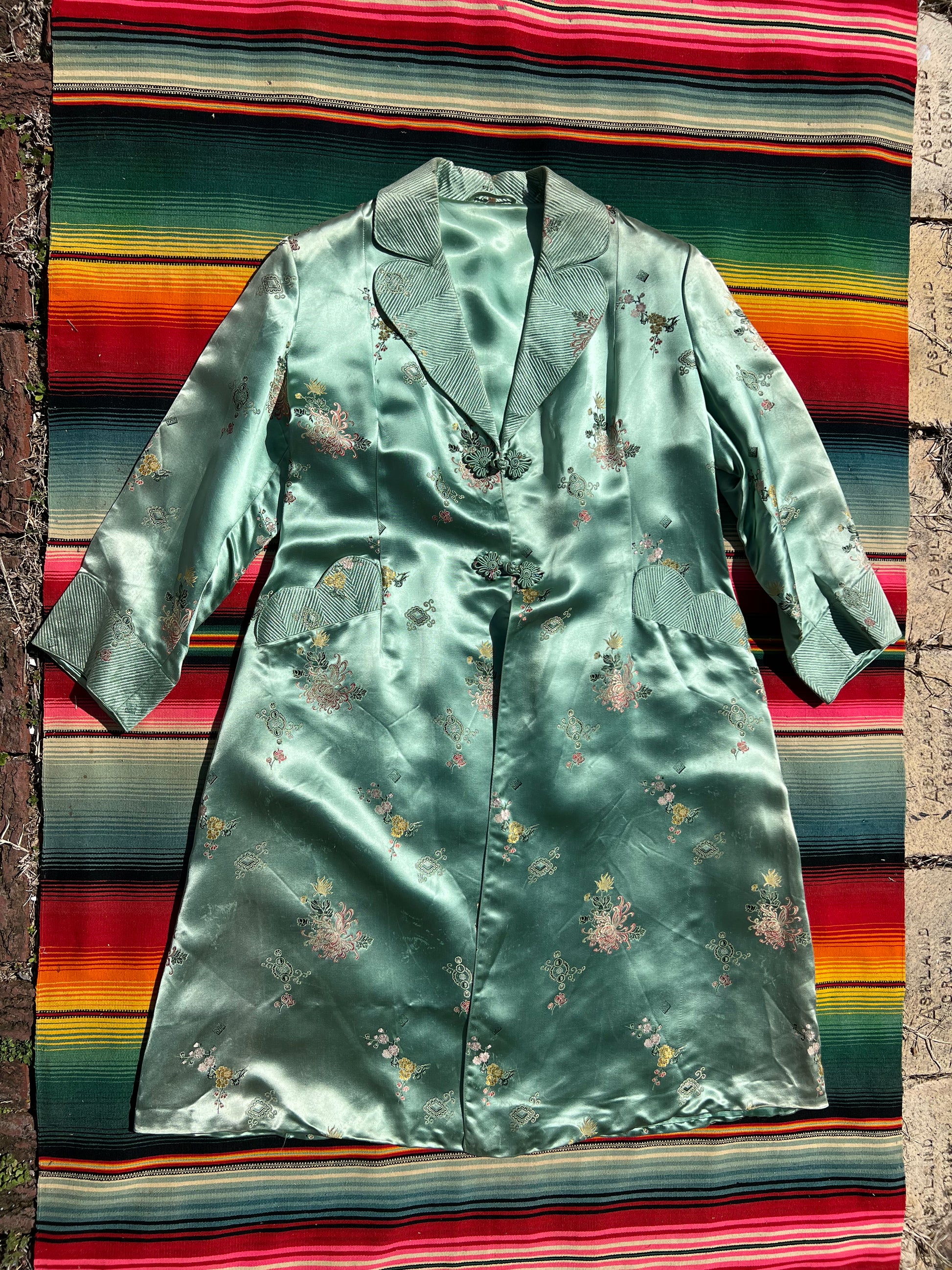 Gorgeous 1940s mint green silk duster, probably originally part of a lounge set made in China for export or for tourists to take home as a souvenir. Features padded shoulders, frog closures, and quilted collar, cuffs, and pockets. Open fit allows it to work for a variety of sizes. There is some light scuffing to the silk throughout, otherwise great condition.
