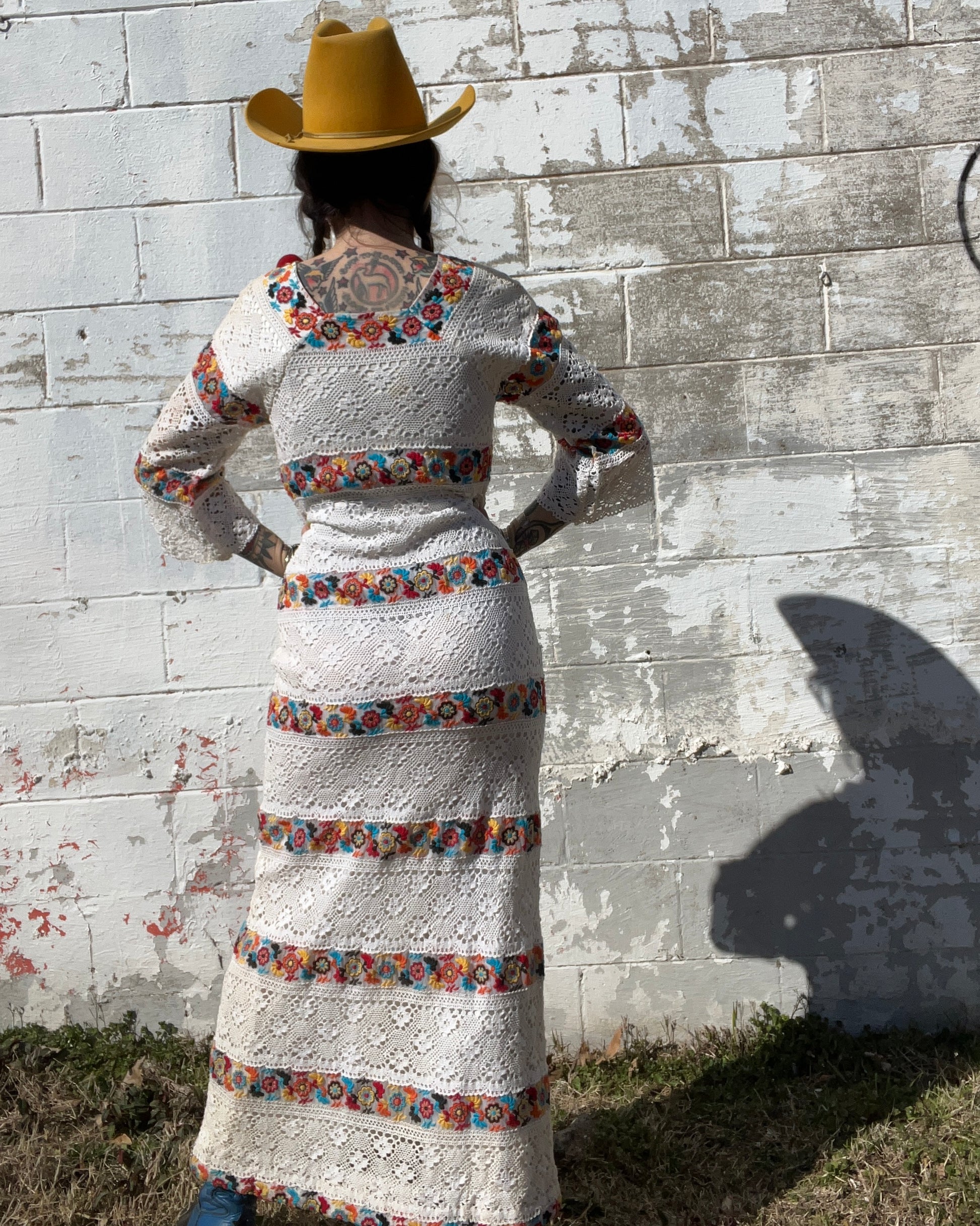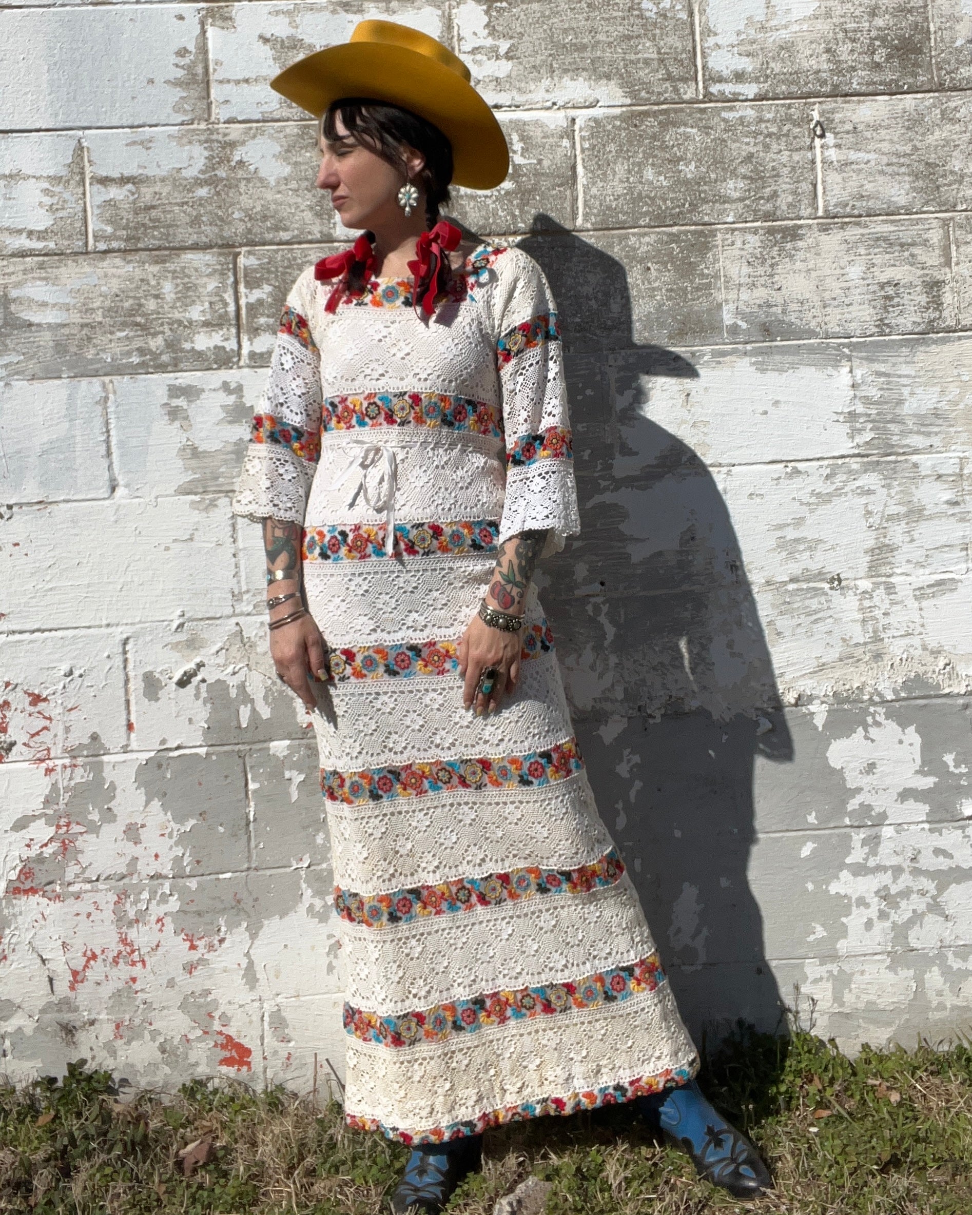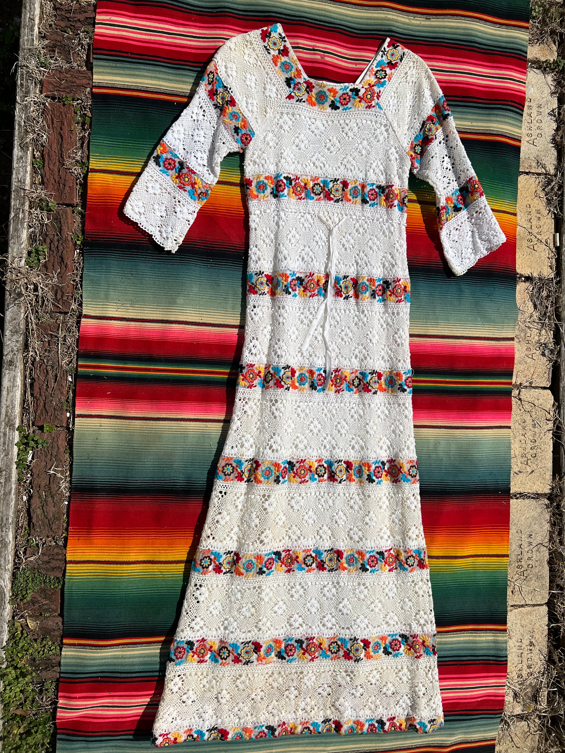 Stunning 1960s maxi dress! Made of white cotton crochet lace, inset with panels of brightly colored embroidered flowers. Also features an empire waist with adjustable ribbon tie, and slightly belled sleeves. A bohemian dream!
