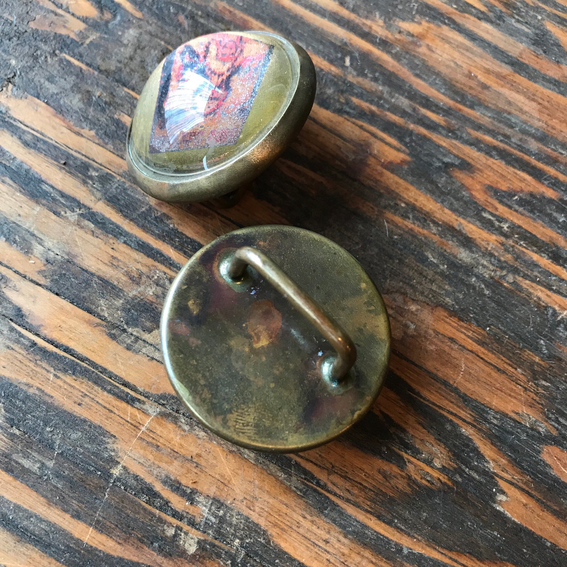 Pair of horse bridle conchos featuring decals from the 101 Ranch Wild West Show. In excellent condition. May be worn a number of ways, but they look wonderful as scarf/necktie embellishments. Sold as a pair.