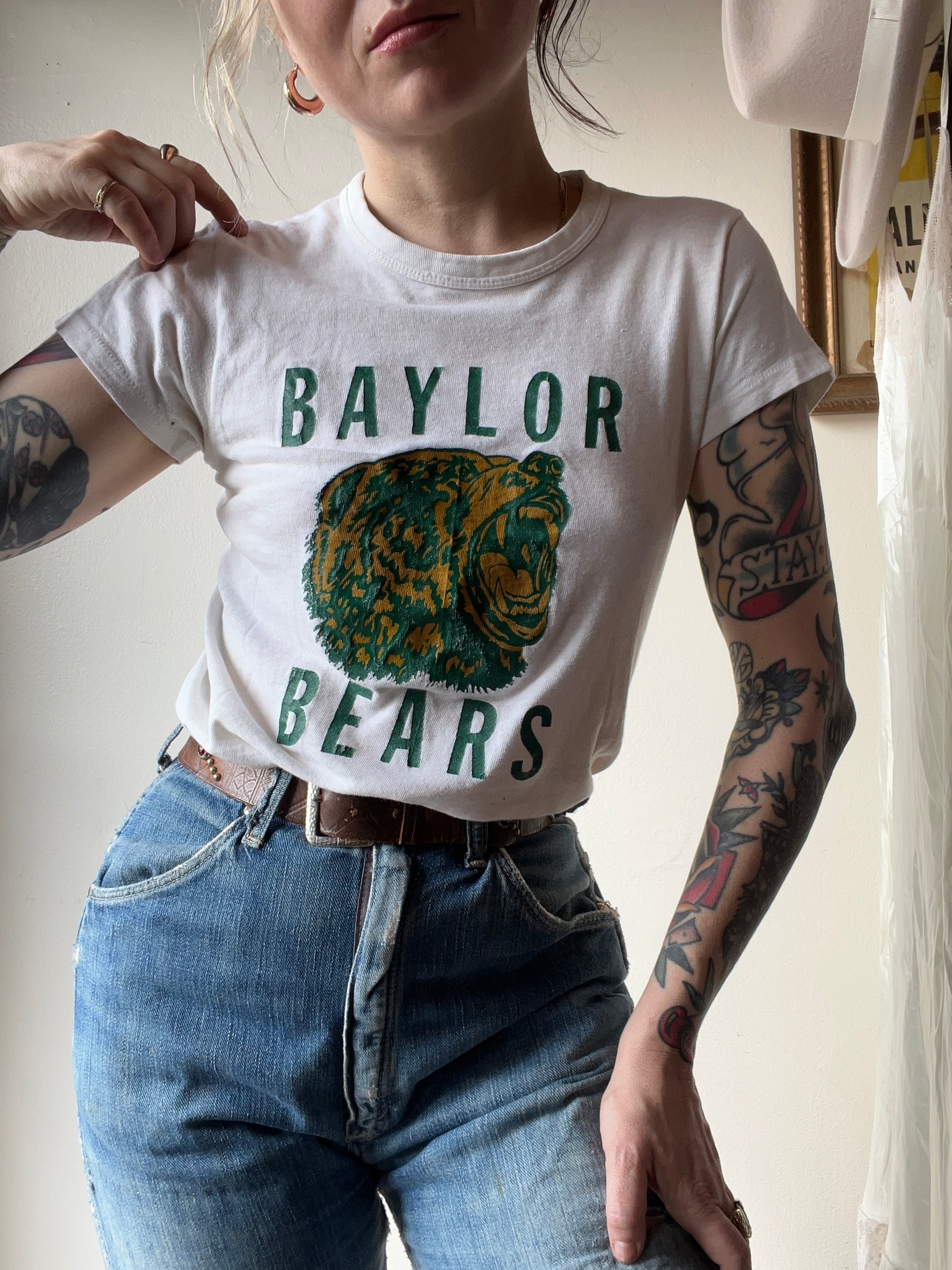 Adorable 1960s Baylor Bears tee! Bear logo on the front, and the name Darryl emblazoned on the back in felt letters. Hanes label. In great vintage condition! Flaws to note: some slight underarm yellowing and a little minor wear to the print, and two tiny holes near hem on the front. Letters on the back are crackling a bit, consistent with age.