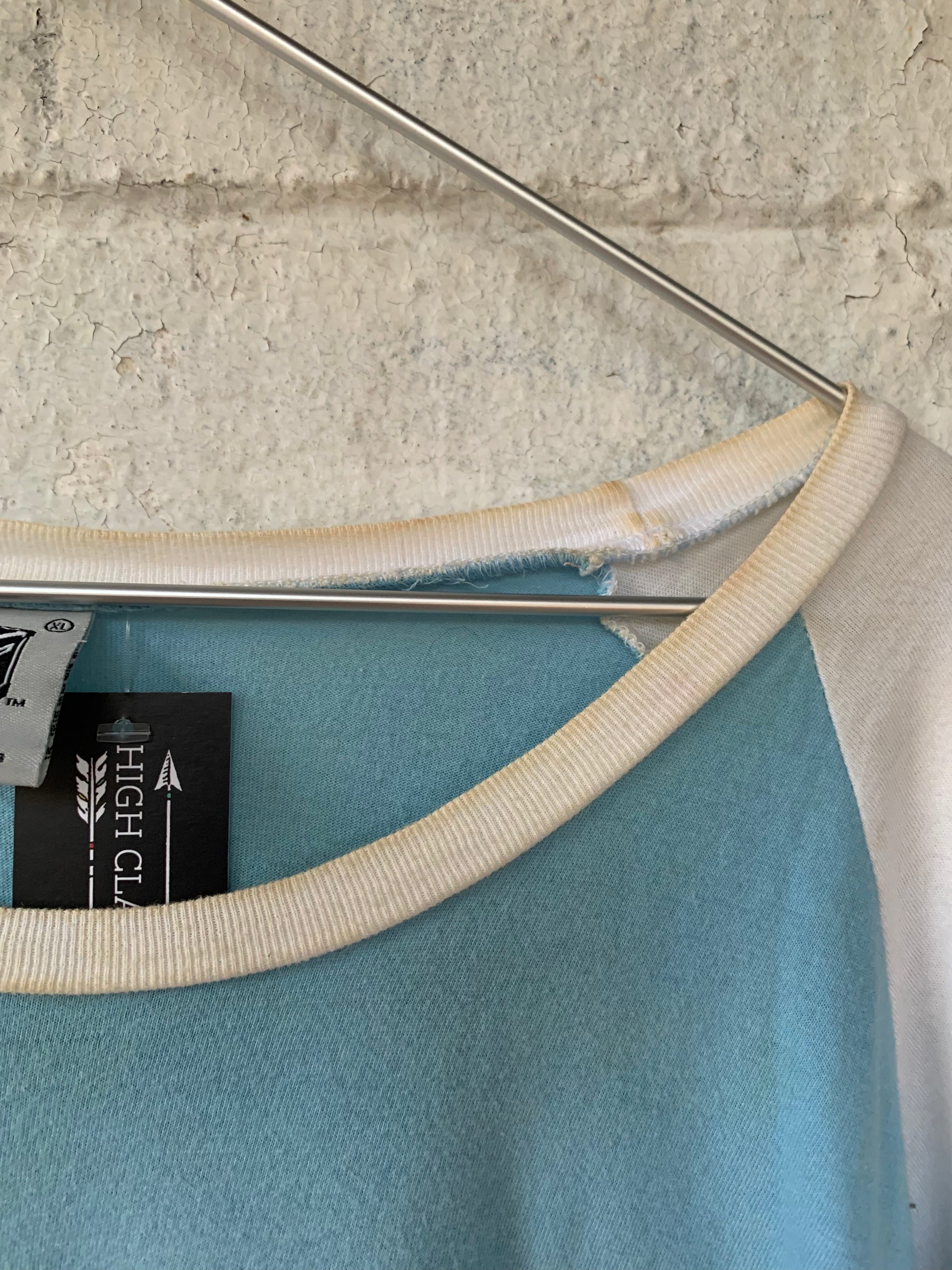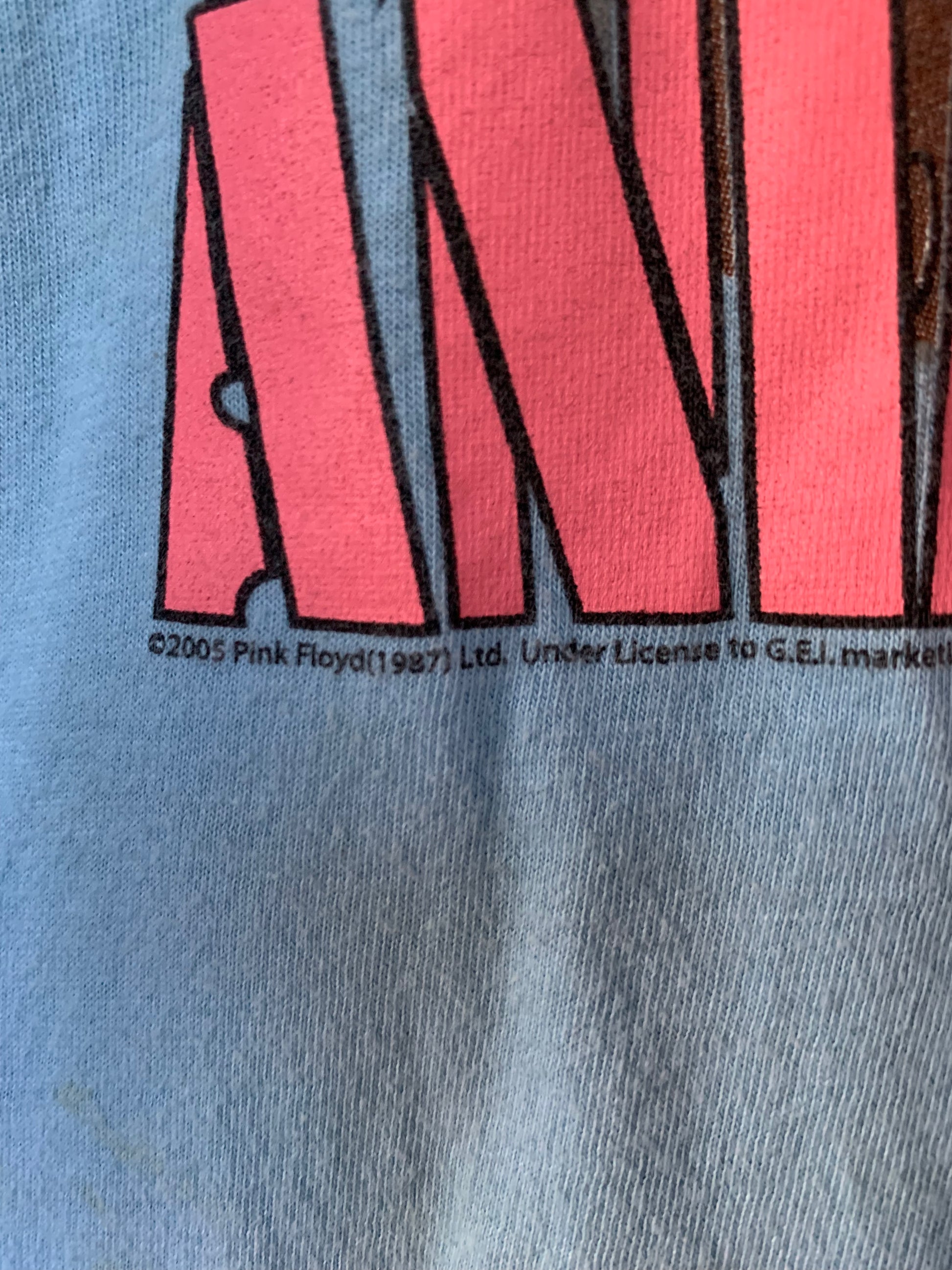 Rad light blue and white 2000’s Pink Floyd Animals raglan Tee. Nice and soft. Has a fair amount of discolorations, please view all photos.